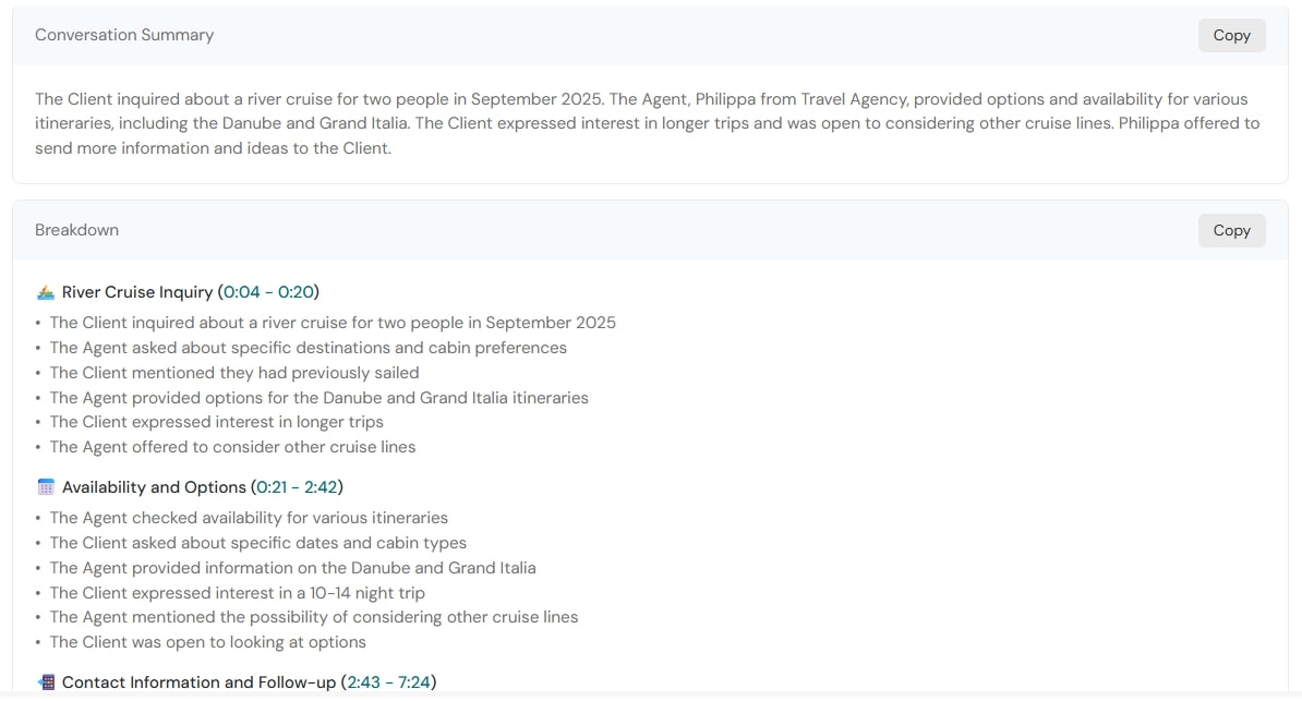 Gone are the days when you’d have to balance creating rapport with a lead while furiously scribbling to remember exactly what you promised and the follow-up actions you need. AI can generate detailed transcripts with tags and summaries just seconds after your call, allowing sales representatives to put down their pens and focus on the client.